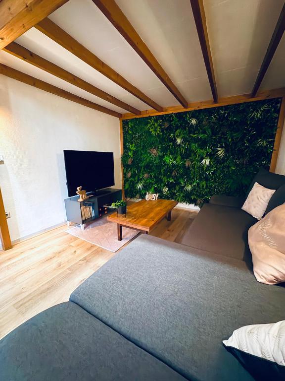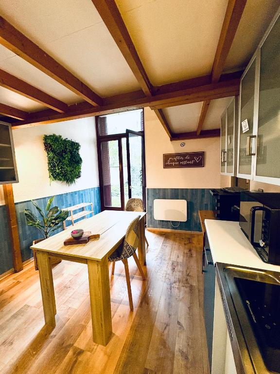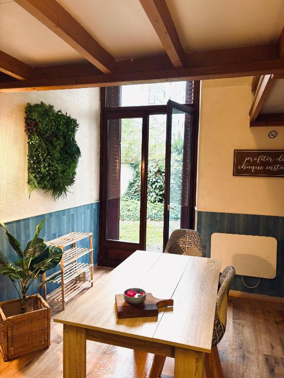 Modern Comforts: Ecrin de verdure Hyper center avec jardin commun in Annecy offers a garden and terrace with free WiFi. The apartment includes a kitchenette, washing machine, and a living room with a ...